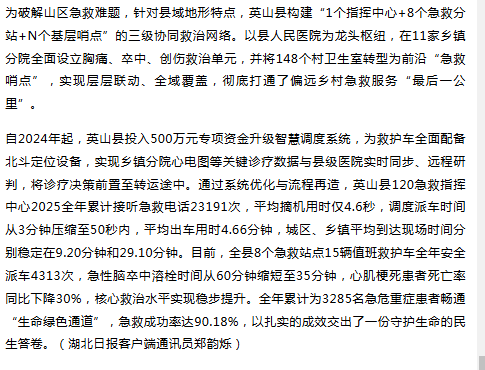 自2024年起,英山县投入500万元专项资金升级智慧调度系统,为救护车全面配备北斗定位设备,实现乡镇分院心电图等关键诊疗数据与县级医院实时同步、远程研判,将诊疗决策前置至转运途中。通过系统优化与流程再造,英山县120急救指挥中心2025全年累计接听急救电话23191次,平均摘机用时仅4.6秒,调度派车时间从3分钟压缩至50秒内,平均出车用时4.66分钟,城区、乡镇平均到达现场时间分别稳定在9.20分钟和29.10分钟。目前,全县8个急救站点15辆值班救护车全年安全派车4313次,急性脑卒中溶栓时间从60分钟缩短至35分钟,心肌梗死患者死亡率同比下降30%,核心救治水平实现稳步提升。全年累计为3285名急危重症患者畅通“生命绿色通道”,急救成功率达90.18%,以扎实的成效交出了一份守护生命的民生答卷。