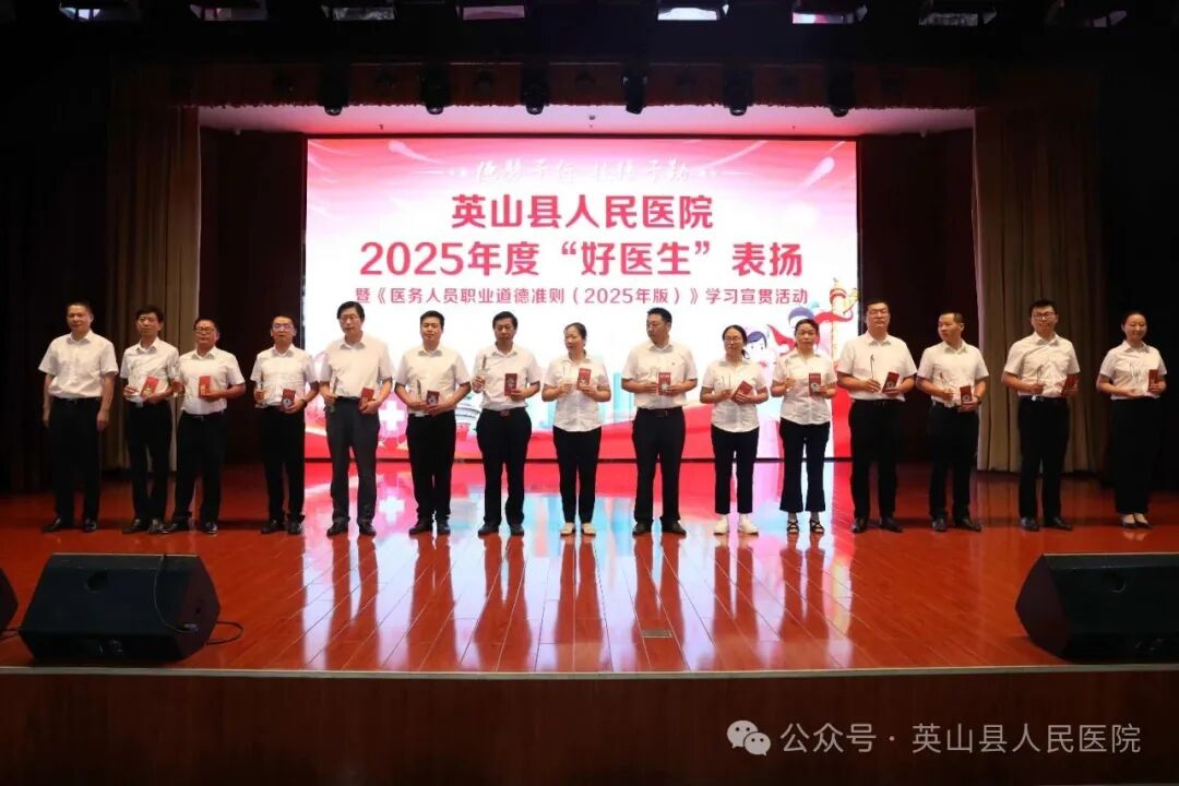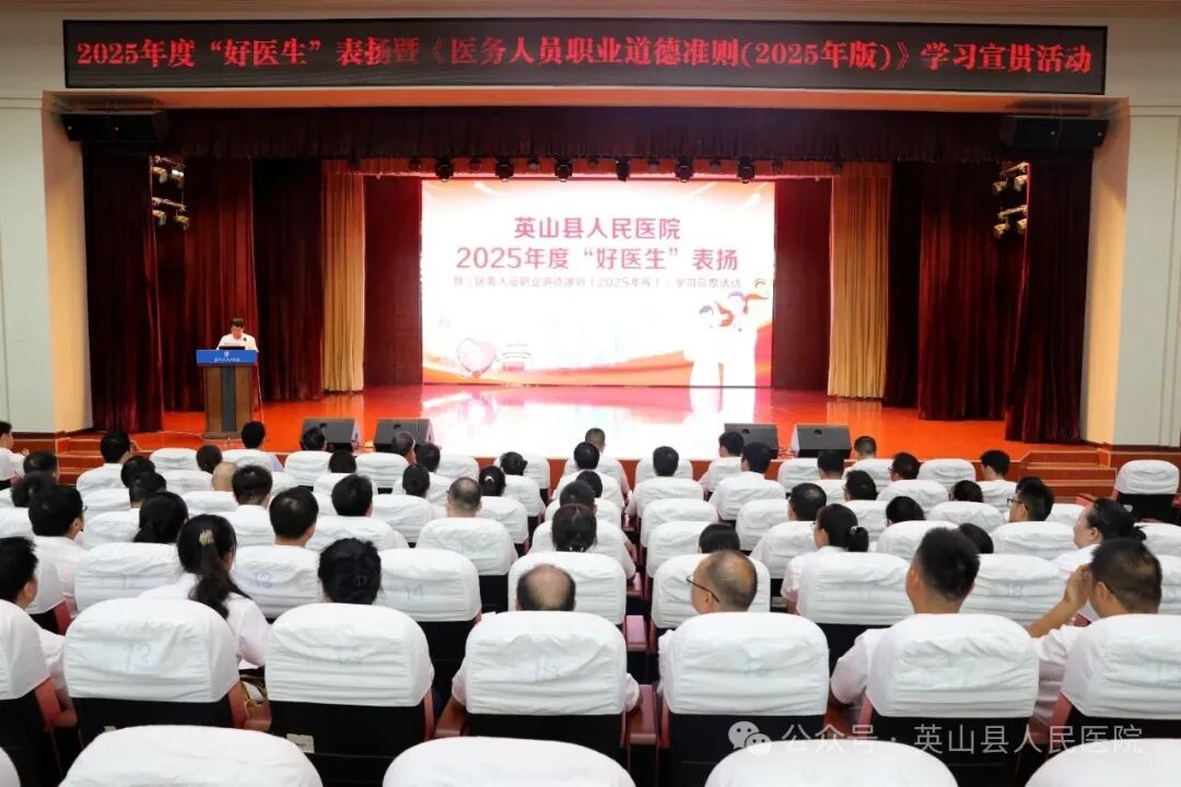 为引领广大医务工作者继承和发扬红医精神、伟大抗疫精神,弘扬崇高职业精神,不断提升道德修养、增强服务能力 ,8月18日,英山县医共体总医院(县人民医院)隆重举行2025年度“好医生”表扬暨《医务人员职业道德准则(2025年版)》学习宣传活动。医院领导班子成员、医师代表及受表扬人员齐聚一堂,共同见证属于医务工作者的荣耀时刻。