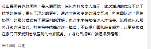 英山县医共体总医院(县人民医院)消化内科负责人表示,此次活动的意义不止于技术的传授,更在于理念的更新。通过与省级专家的深度互动,科室团队对“医护协同”的服务模式有了更深刻的理解,也对未来持续推进人才培养、流程优化和服务升级充满信心。科室将持续推进这一模式,不断提升团队综合能力,让更多患者在家门口享受到省级医院的专家服务。(湖北日报客户端通讯员 程佩)