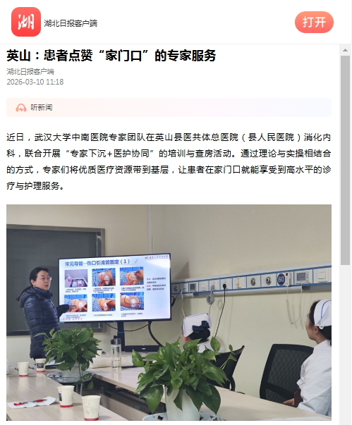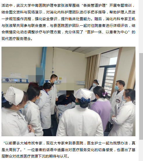 近日,武汉大学中南医院专家团队在英山县医共体总医院(县人民医院)消化内科,联合开展“专家下沉+医护协同”的培训与查房活动。通过理论与实操相结合的方式,专家们将优质医疗资源带到基层,让患者在家门口就能享受到高水平的诊疗与护理服务。