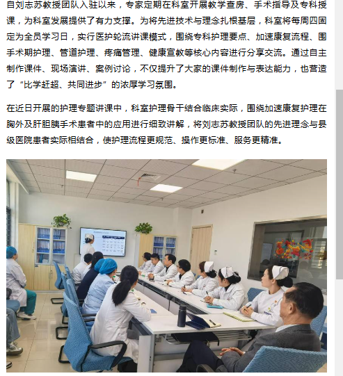 在近日开展的护理专题讲课中,科室护理骨干结合临床实际,围绕加速康复护理在胸外及肝胆胰手术患者中的应用进行细致讲解,将刘志苏教授团队的先进理念与县级医院患者实际相结合,使护理流程更规范、操作更标准、服务更精准。