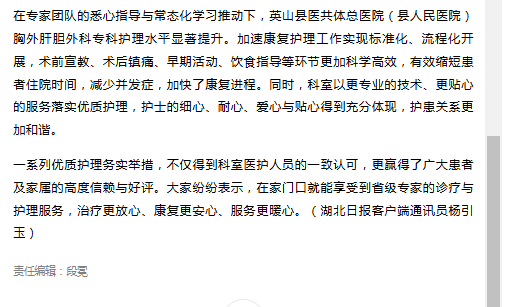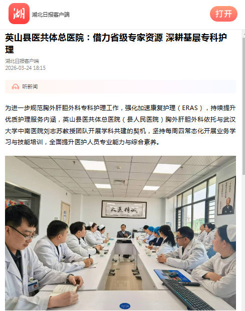 在专家团队的悉心指导与常态化学习推动下,英山县医共体总医院(县人民医院)胸外肝胆外科专科护理水平显著提升。加速康复护理工作实现标准化、流程化开展,术前宣教、术后镇痛、早期活动、饮食指导等环节更加科学高效,有效缩短患者住院时间,减少并发症,加快了康复进程。同时,科室以更专业的技术、更贴心的服务落实优质护理,护士的细心、耐心、爱心与贴心得到充分体现,护患关系更加和谐。