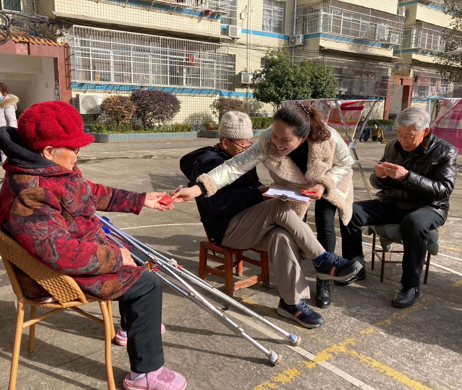 在老院区职工宿舍的操场上,王勤、刘冬红、方娟涓、志愿者们与退休职工们促膝交心谈心,详细询问他们的身体健康状况,基本生活情况,有没有需要帮助的地方。发放购物卡的同时,志愿者们为他们测量血压。