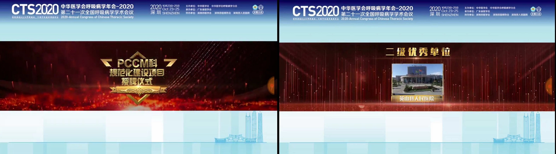 (通讯员 郑韵烁)10月23日中华医学会呼吸病学年会-2020(第二十一次全国呼吸病学学术会议)在广东省深圳市以线上线下相结合的形式召开,一年一度的全国呼吸病学学术会议是国内呼吸病学界学术水平和规格最高的学术会议,也是不同学术思想融合、展示我国呼吸病学最新研究成果、推动学科全面发展的一个重要平台,更是有重要影响力、呼吸同道广泛参与的业界盛会。本次年会的主题是“持续推进PCCM学科建设,引领呼吸道传染病防治”。同时,国家PCCM科规范化建设项目认定结果发布,会上公布了国家通过的呼吸与危重症医学科规范化建设评定的医院名单。英山县人民医院呼吸与危重症医学科评定通过,并荣获了国家呼吸与危重症医学科规范化建设项目二级医院“优秀单位”的荣誉称号。本次获此殊荣,标志着英山县人民医院呼吸与危重症医学科的建设已步入了国家优秀学科建设行列。