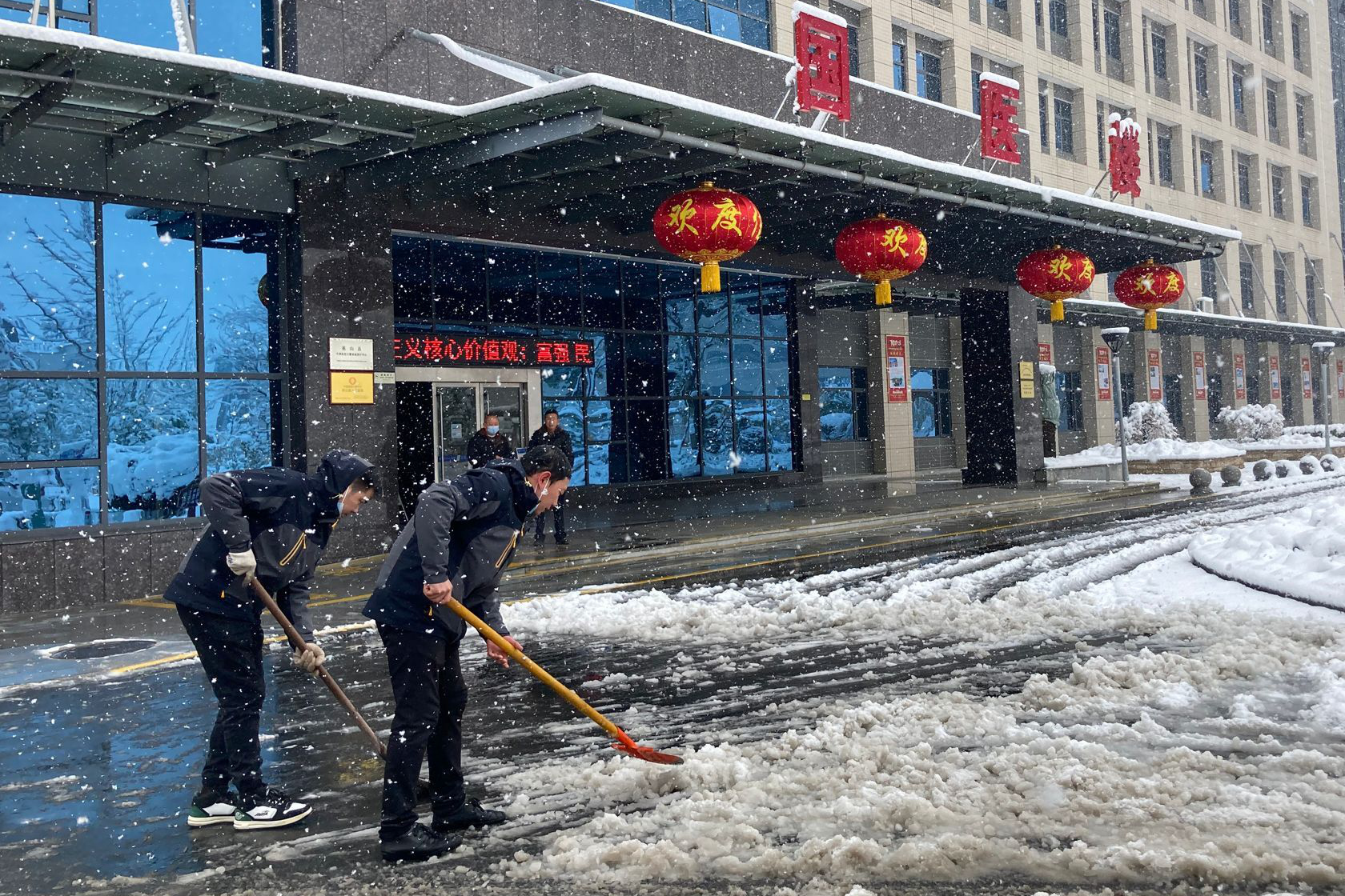 虽天气寒冷,雪花漫天,但大家热情不减,铲雪、撒盐、除冰、冲洗道路,有条不紊地将路面积雪逐一清理,全力以赴以实际行动保障患者就诊的安全和便利。