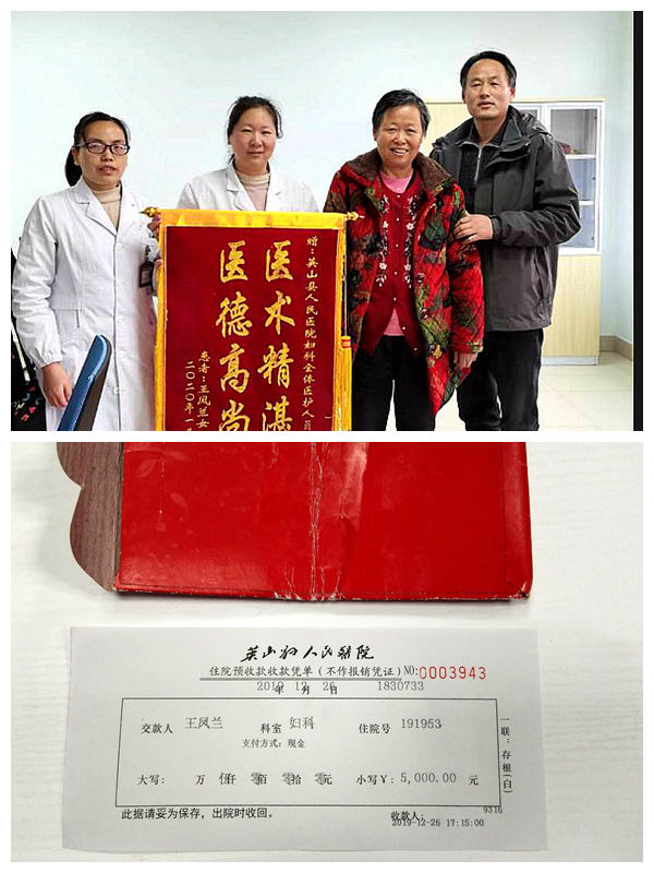 2020年1月5日,王老太痊愈出院。为表达感激之情,这天早上,胡先生搀扶着母亲给妇科医护人员送来一面锦旗,上书“医术精湛 医德高尚”,正是对舒新红一行医护人员的由衷称赞。