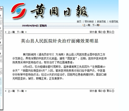 [黄冈日报]英山县人民医院针灸治疗面瘫效果明显