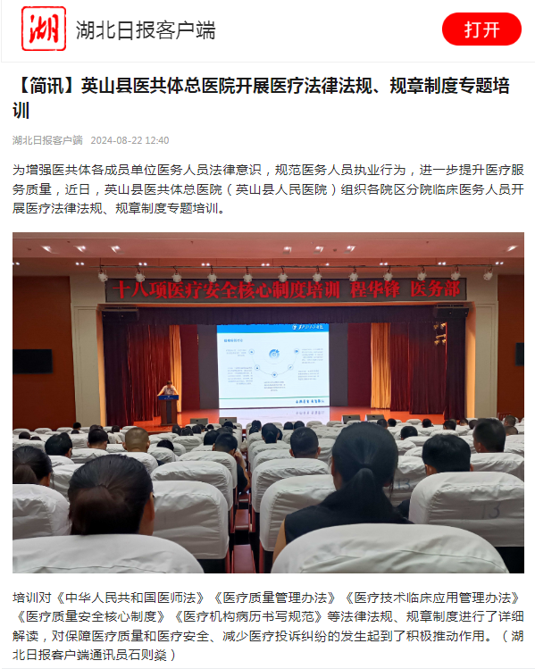 【湖北日报】英山县医共体总医院开展医疗法律法规、规章制度专题培训