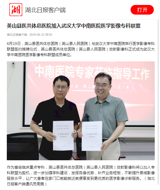 【湖北日报】英山县医共体总医院加入武汉大学中南医院医学影像专科联盟