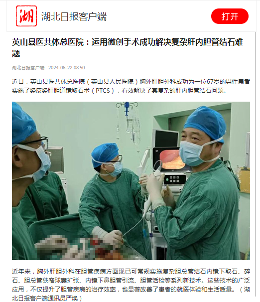 【湖北日报】英山县医共体总医院:运用微创手术成功解决复杂肝内胆管结石难题