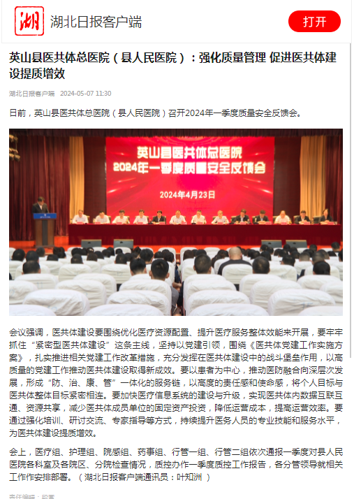 【湖北日报】英山县医共体总医院(县人民医院):强化质量管理 促进医共体建设提质增效